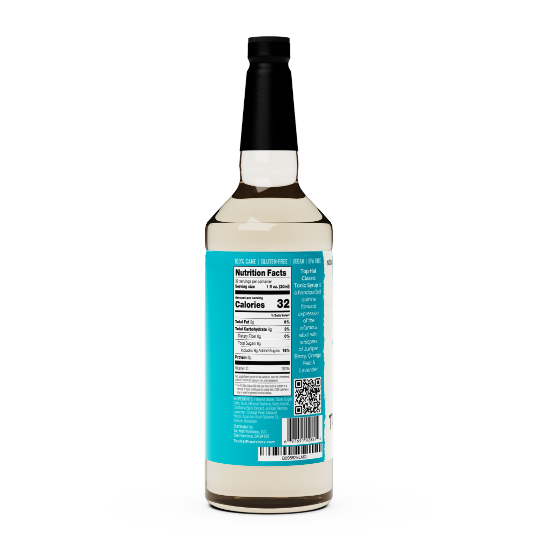 Top Hat Classic Tonic Syrup & 5x Quinine Tonic Water Concentrate is the lighter and more refreshing Mediterranean profile of our three tonic syrups - made with the same amount of the finest natural quinine as our East India Tonic sustainably extracted from cinchona bark grown in the Eastern Congolese region of Africa. The bright and refreshing botanical profile of this tonic has a balanced bitter foundation with a whispering chorus of lavender, orange peel, and juniper. The clean crisp bittersweet balance of this syrup is made smooth and silky by using only 100% pure cane sugar.