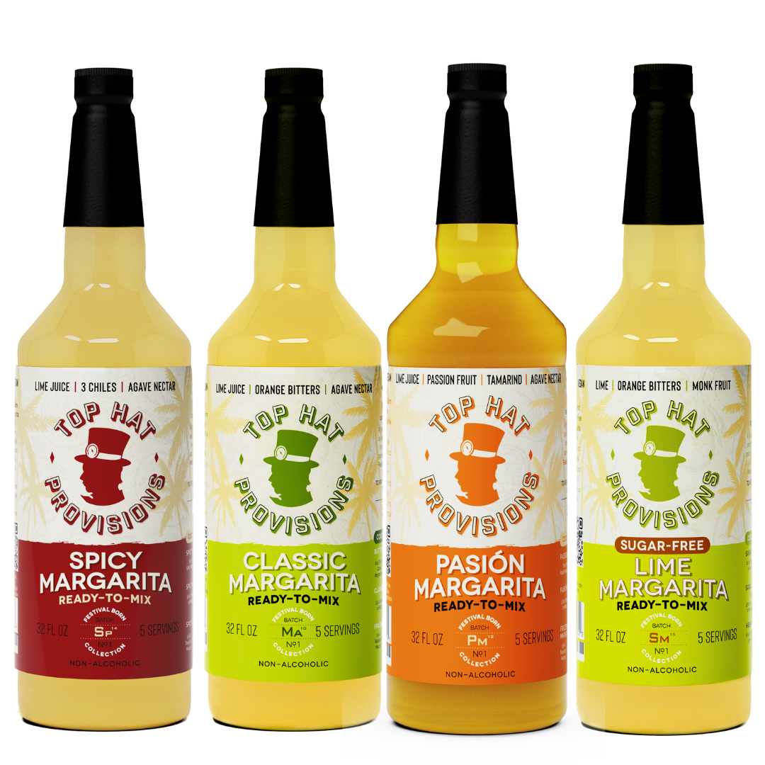 The Top Hat Margarita Party Combo Kit is the ultimate collection of margarita mixers, offering everything you need to craft exceptional margaritas, mocktails, and other citrus-forward beverages. This set includes Top Hat Classic Margarita Mix, Sugar-Free Lime Margarita Mix, Spicy Margarita Mix, and Passion Fruit Margarita Mix. Each mixer is handcrafted with the finest natural ingredients, designed to elevate your cocktail game with vibrant, refreshing flavors.