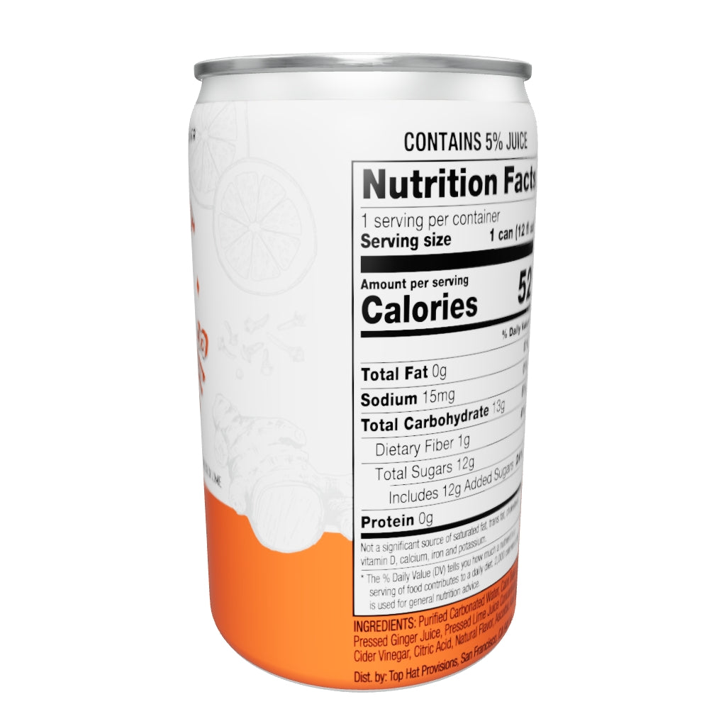 - Ingredients: Purified Carbonated Water, Cane Sugar, Cold-Pressed Ginger Juice, Pressed Lime Juice Concentrate, Apple Cider Vinegar, Citric Acid, Natural Flavors, Ascorbic Acid (Vitamin C)
